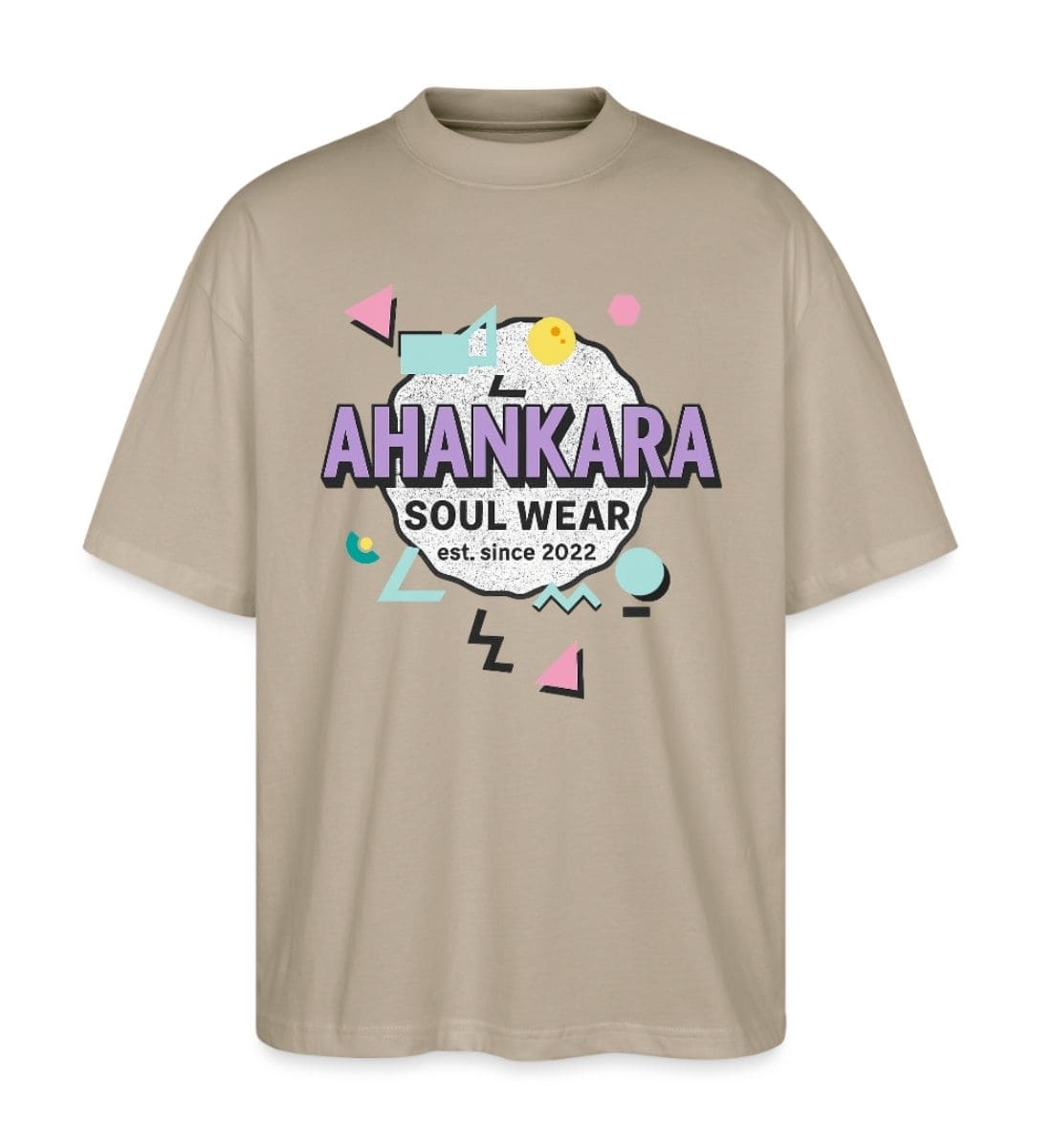 Der zentrale Schriftzug wird von grafischen Elementen im typischen Memphis-Look umrahmt – eine Hommage an die kreative Energie der 90s Pop Art Bewegung. Der Druck hebt sich deutlich von klassischen Retro-Designs ab und sorgt für einen individuellen Look mit Charakter.